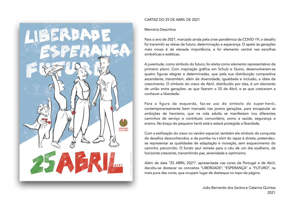 No ano de 2020, ainda antes da pandemia se instalar com essa escala, a Associação 25 de Abril convidou-me para desenvolver um cartaz comemorativo do 46.º Aniversário da Revolução dos Cravos. A criação da medalha comemorativa ficou a cargo do Escultor João Duarte.