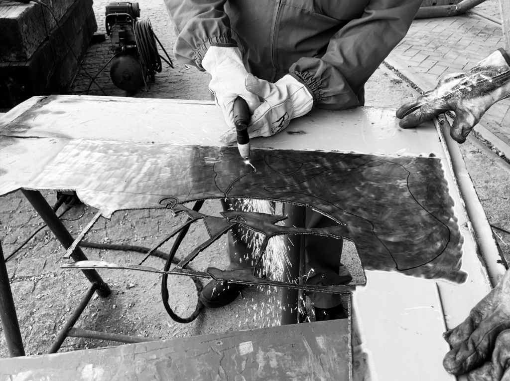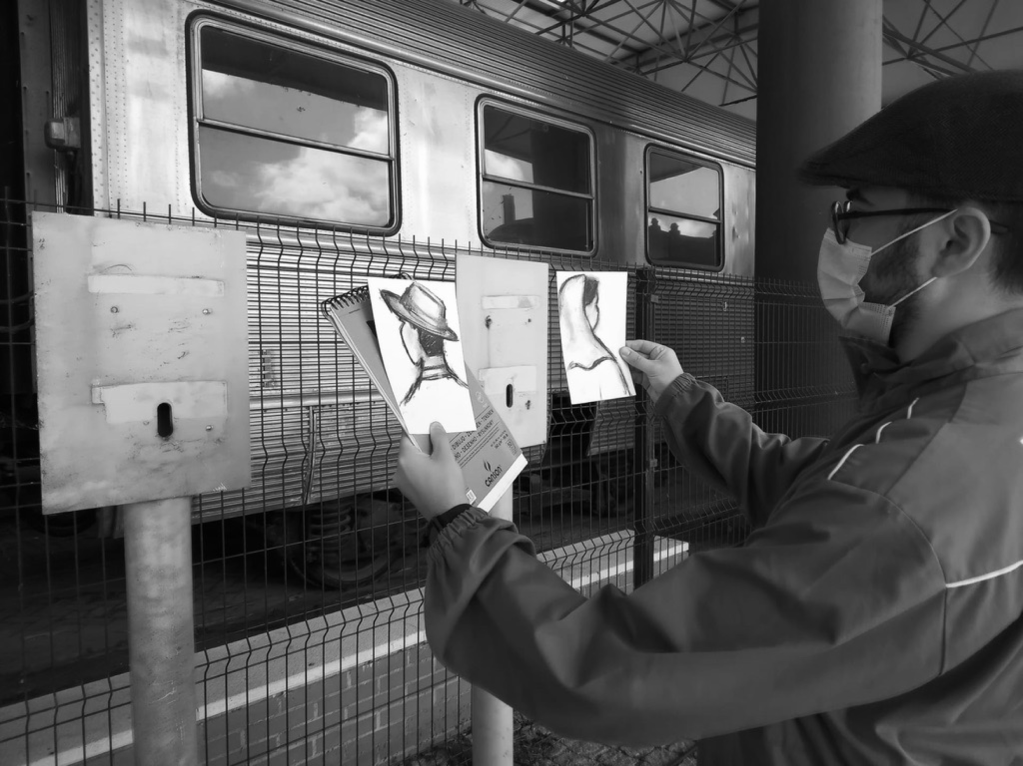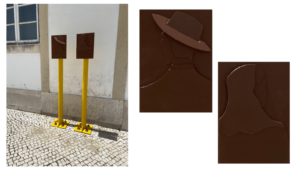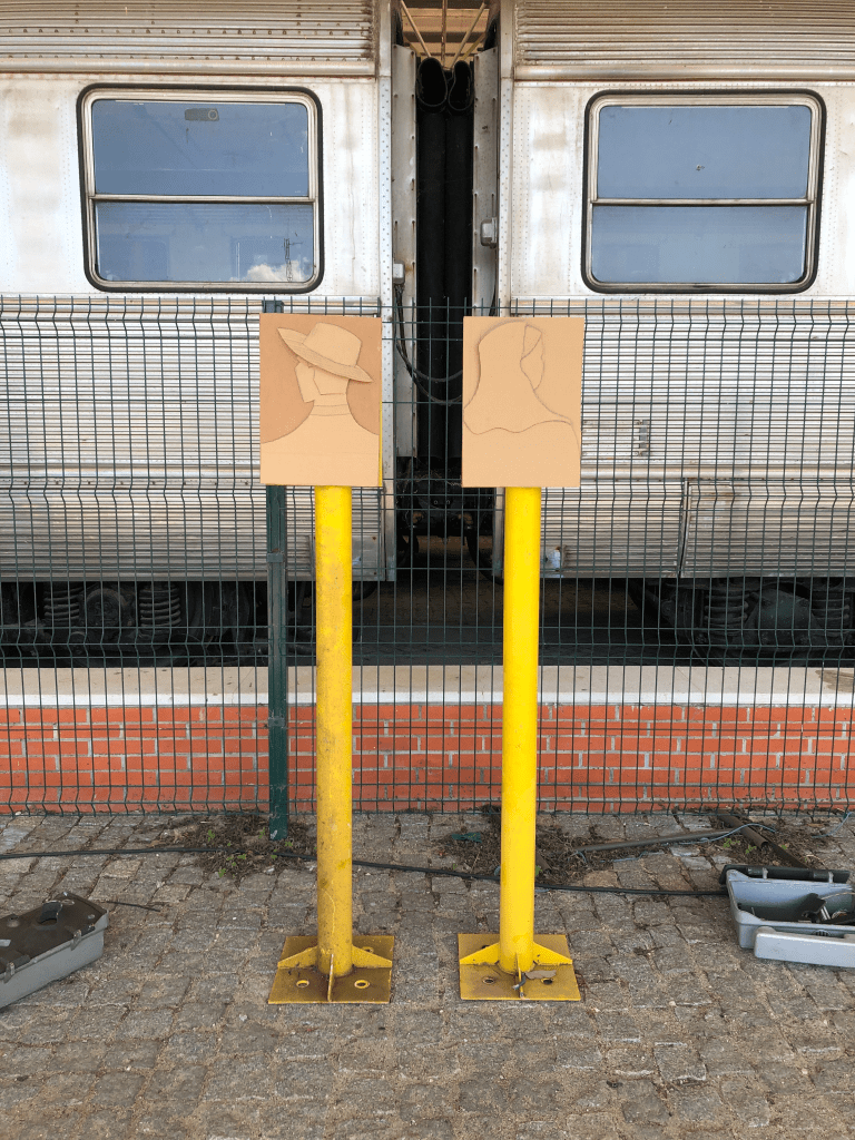 “A estadia no Entroncamento para o propósito deste simpósio permitiu um mergulho no mundo fascinante da máquina e da indústria que é o universo ferroviário. Da visita ao Museu Nacional Ferroviário, e vivência nos seus espaços, surgiu a vontade de homenagear todas as pessoas envolvidas na História tão rica da ferrovia em Portugal. Com matérias recuperadas do terreno e, por isso, carregadas de energia e memória, propus criar dois retratos sintéticos, um masculino e um feminino que, não representando pessoas particulares, representam toda a família ferroviária. Pretendi sublinhar o esforço de equipa, de todos e todas, destacando a parte humana que num meio industrial de grandes pesos os guia e maneja. Os retratos dispõem-se sugerindo um olhar para o horizonte, para o futuro em aberto. A sua fixação sobre os postes de comunicação estabelece uma relação simbólica de contacto e ligações, cumprindo o característico amarelo a chamada de atenção para a homenagem pretendida.