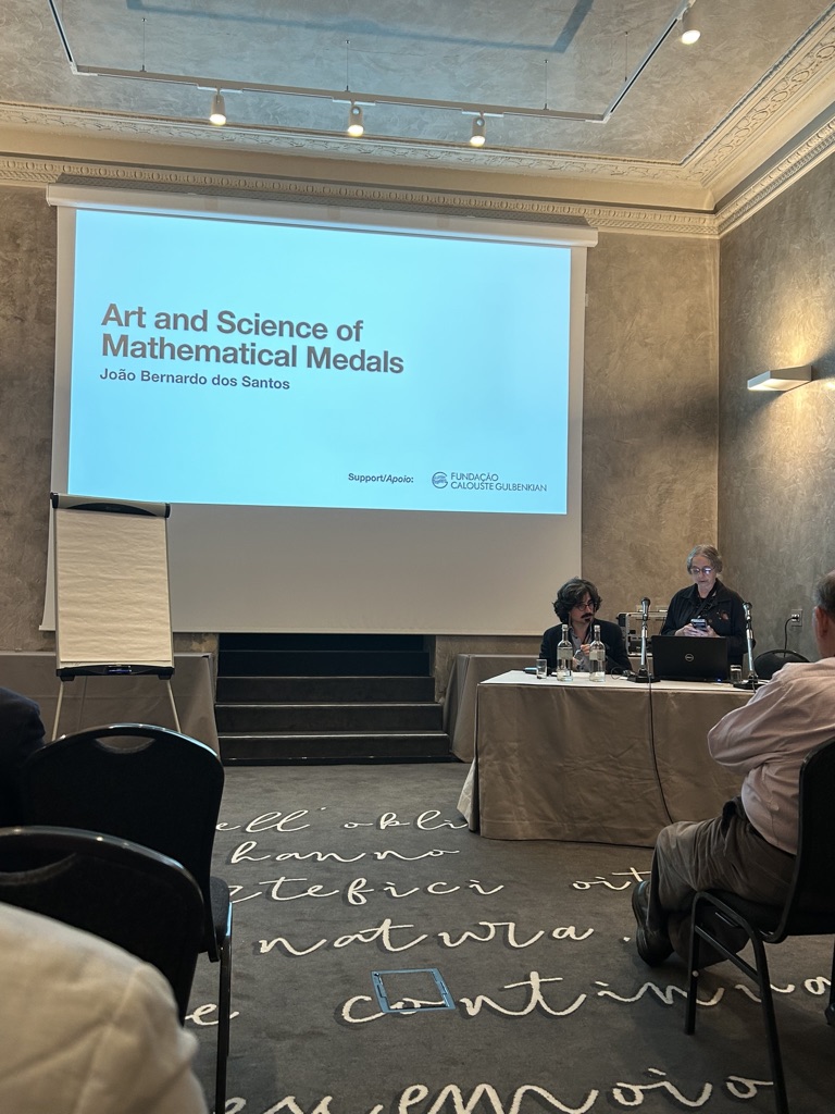 A minha participação, apoiada pela Fundação Calouste Gulbenkian, incluiu a palestra Art and Science of Mathematical Medals. Nela, apresentei um tema da relação entre Arte e Ciência, analisando medalhas portuguesas contemporâneas que expressam propriedades estéticas inerentes aos temas e objectos matemáticos, encontrando paralelismo entre os processos e motivações dos matemáticos e dos artistas plásticos. Um artigo associado à palestra será publicado na próxima edição da revista Médailles.